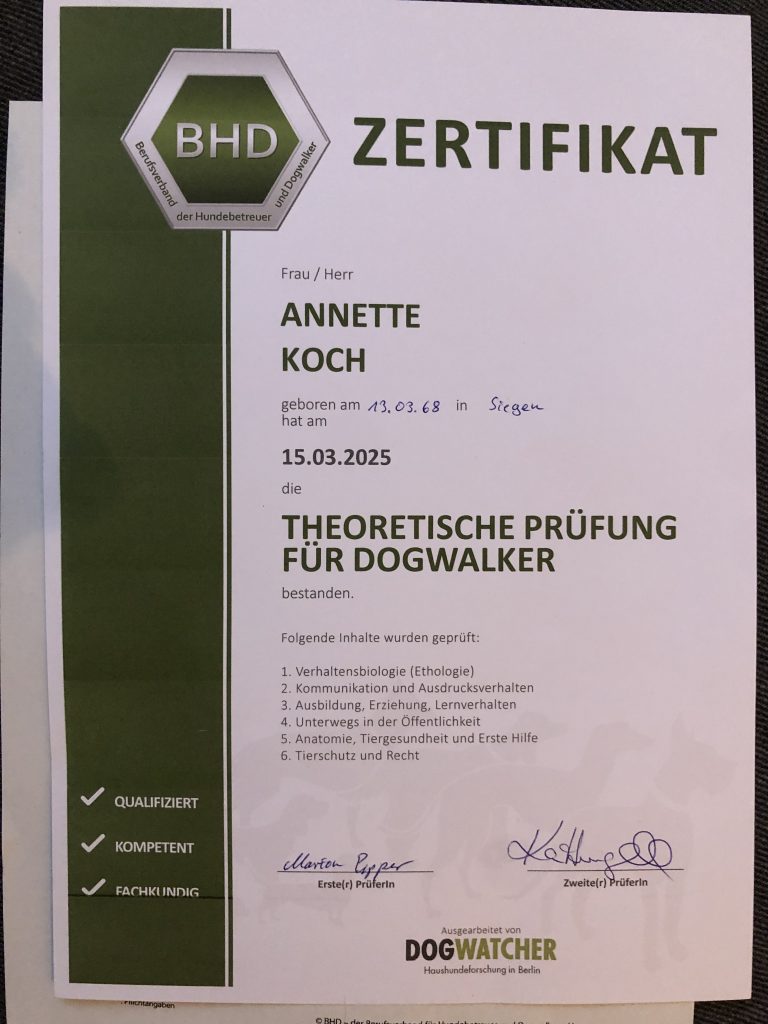 Bei Dogmenti und Stephanie Zänker machte ich eine Ausbildung zur Hundetrainerin. 2025 habe ich eine Weiterbildung bei Magdalena Artowitz als Hundeverhaltenstrainer begonnen.